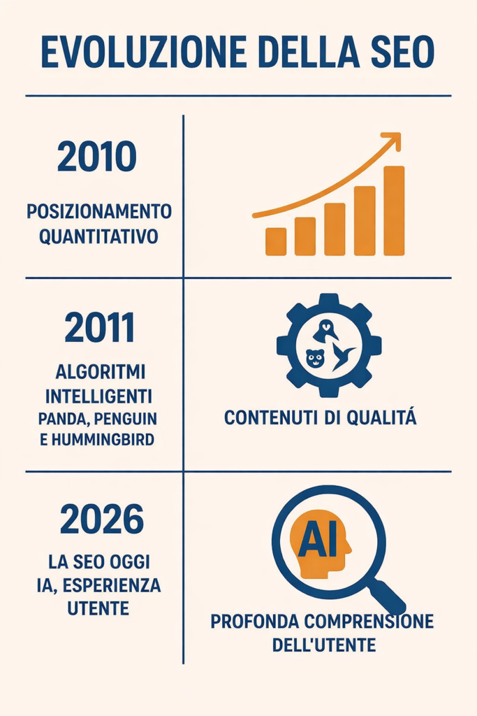 Con aggiornamenti importanti come Panda, Penguin e Hummingbird, Google ha iniziato a penalizzare i siti che utilizzavano pratiche scorrette e a premiare quelli con contenuti di qualità, link naturali e un’ottima esperienza utente.